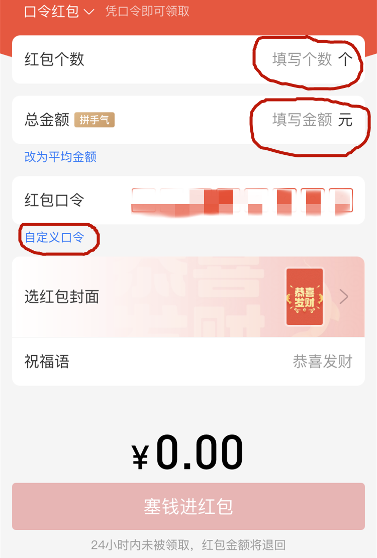第四步(设置红包个数为1,金额270,并自定义红包口令,口令不要太简单)